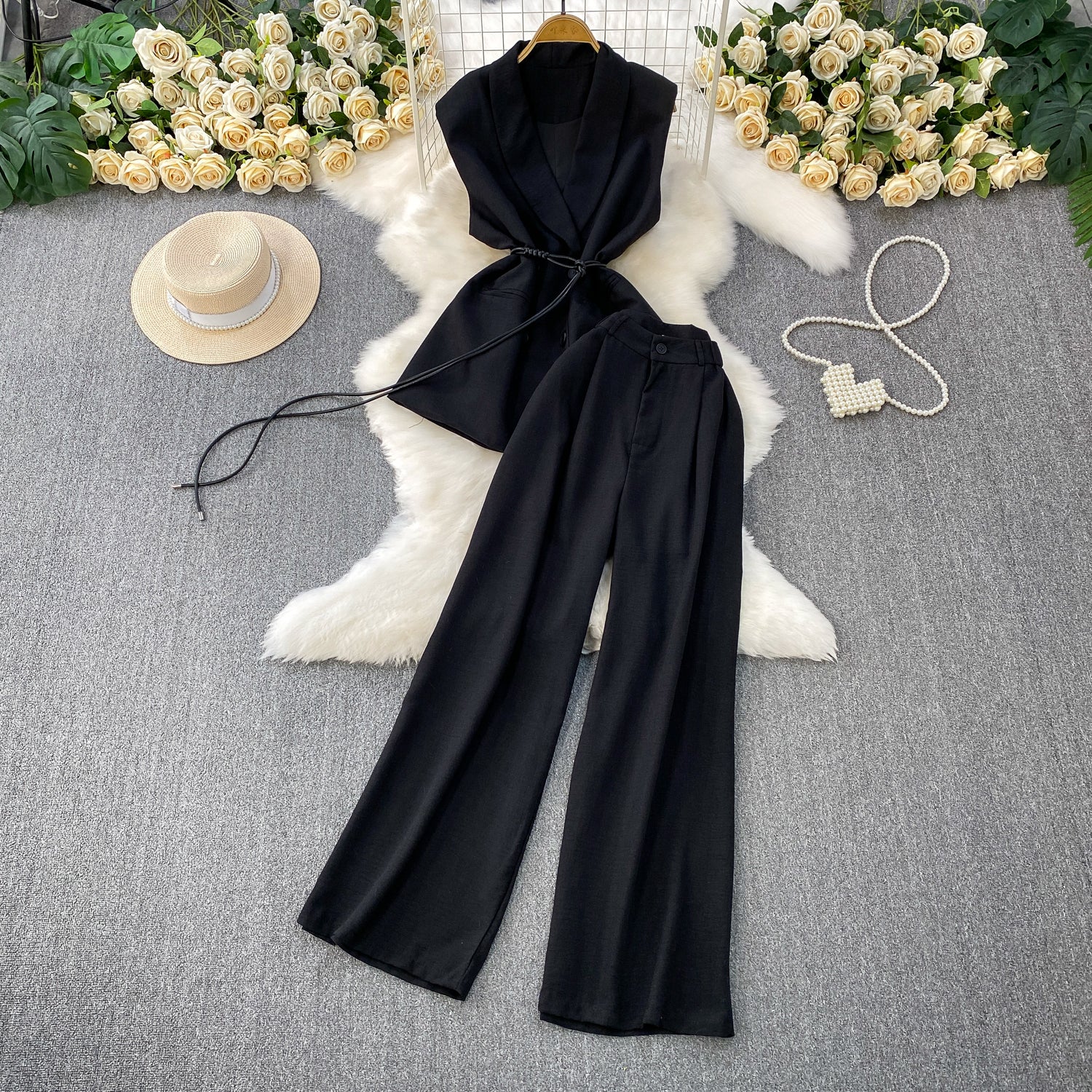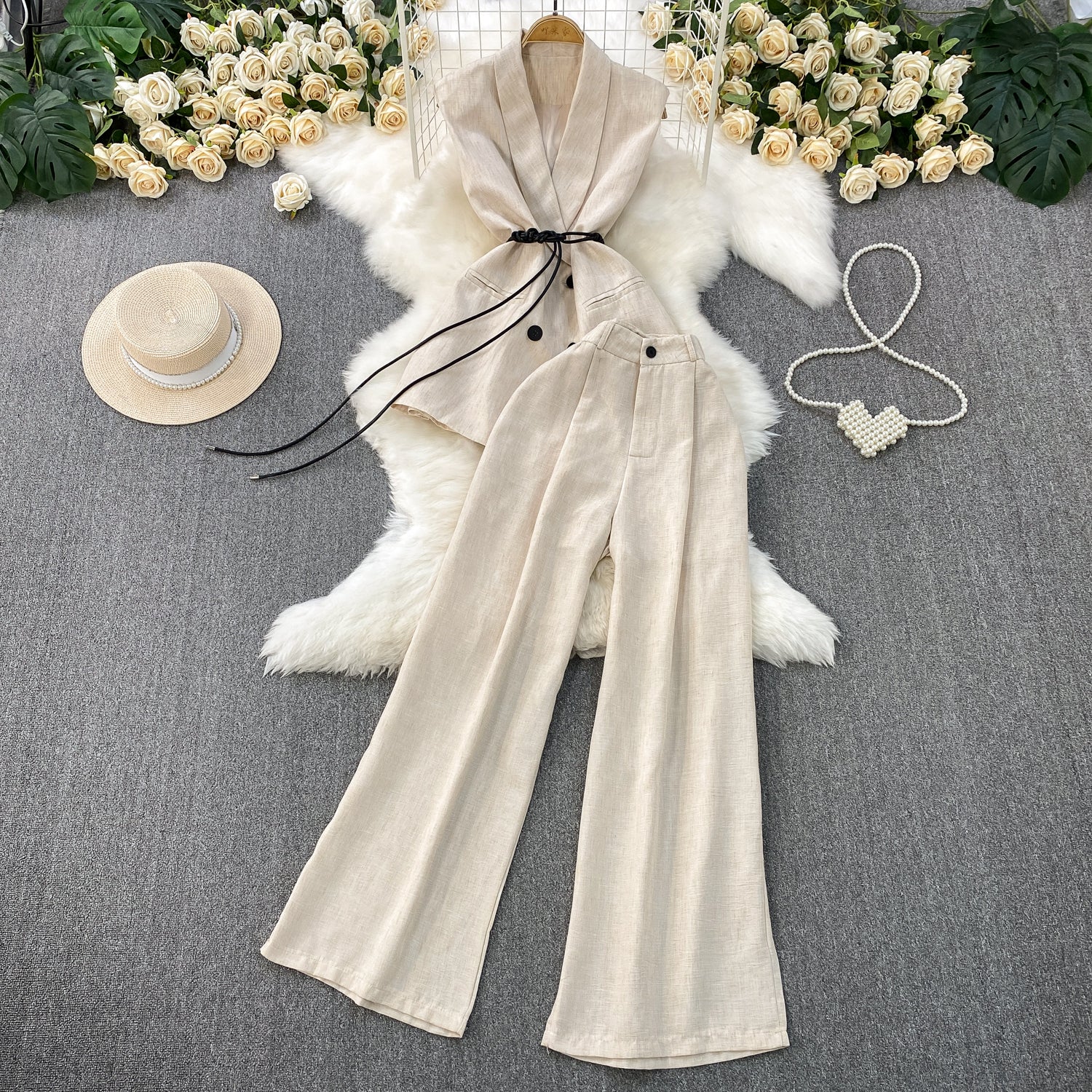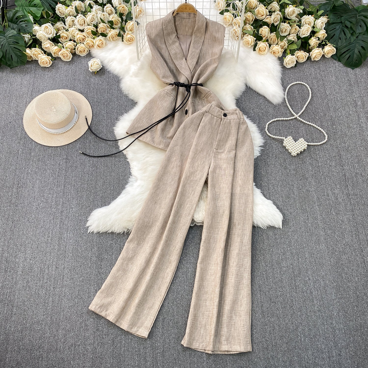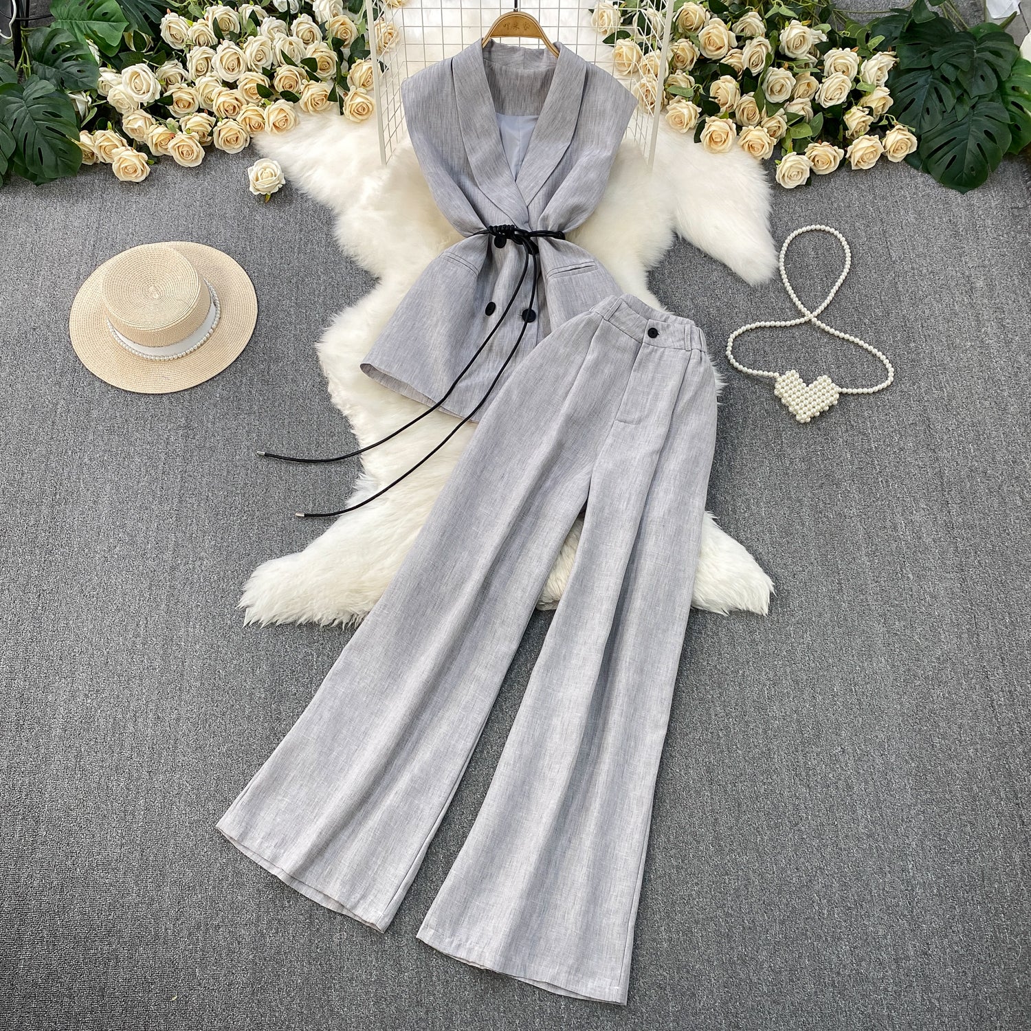 High-Grade Gray West Assembly V-Neck Double Buckle Vest Sleeveless Waist Blouse + High Waist-High-Scretch Broad-Legged Trousers Two