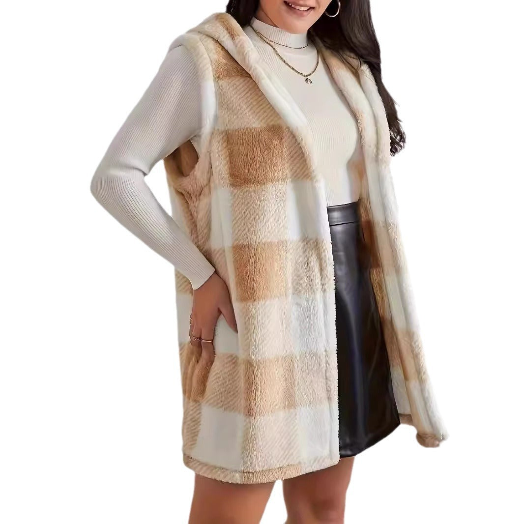 Autumn And Winter Fashion Burst Temperament Cardigan Two-Color Lattice Hooded Lady Plush Vest Coat Woman
