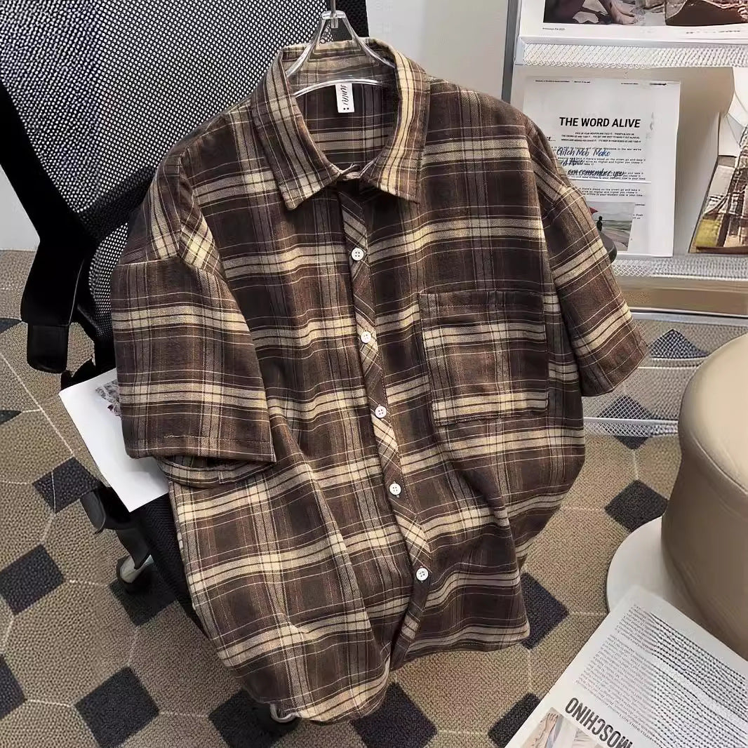 Plaid Short-Sleeved Shirt Men's Summer Retro Casual Five-Sleeve Shirt High Street Tide Coat