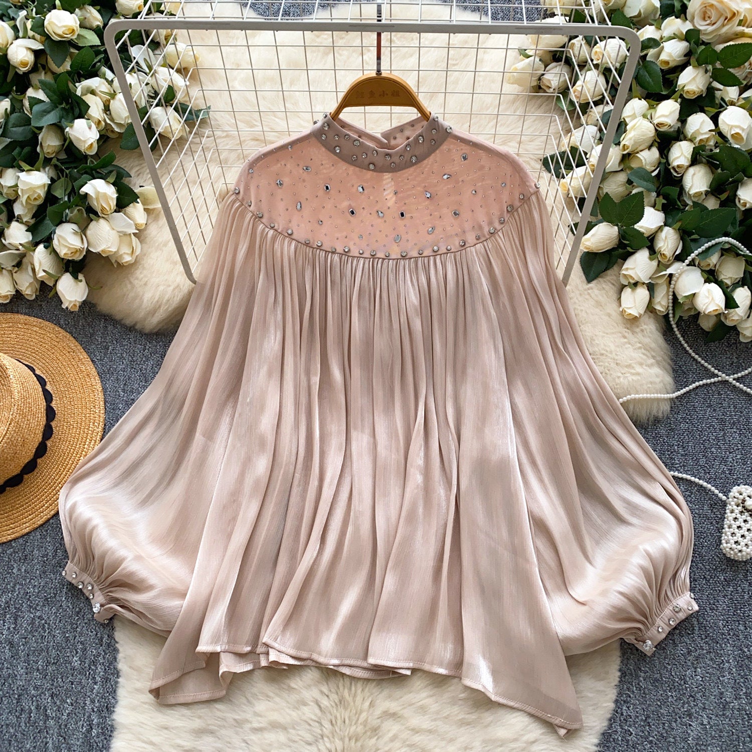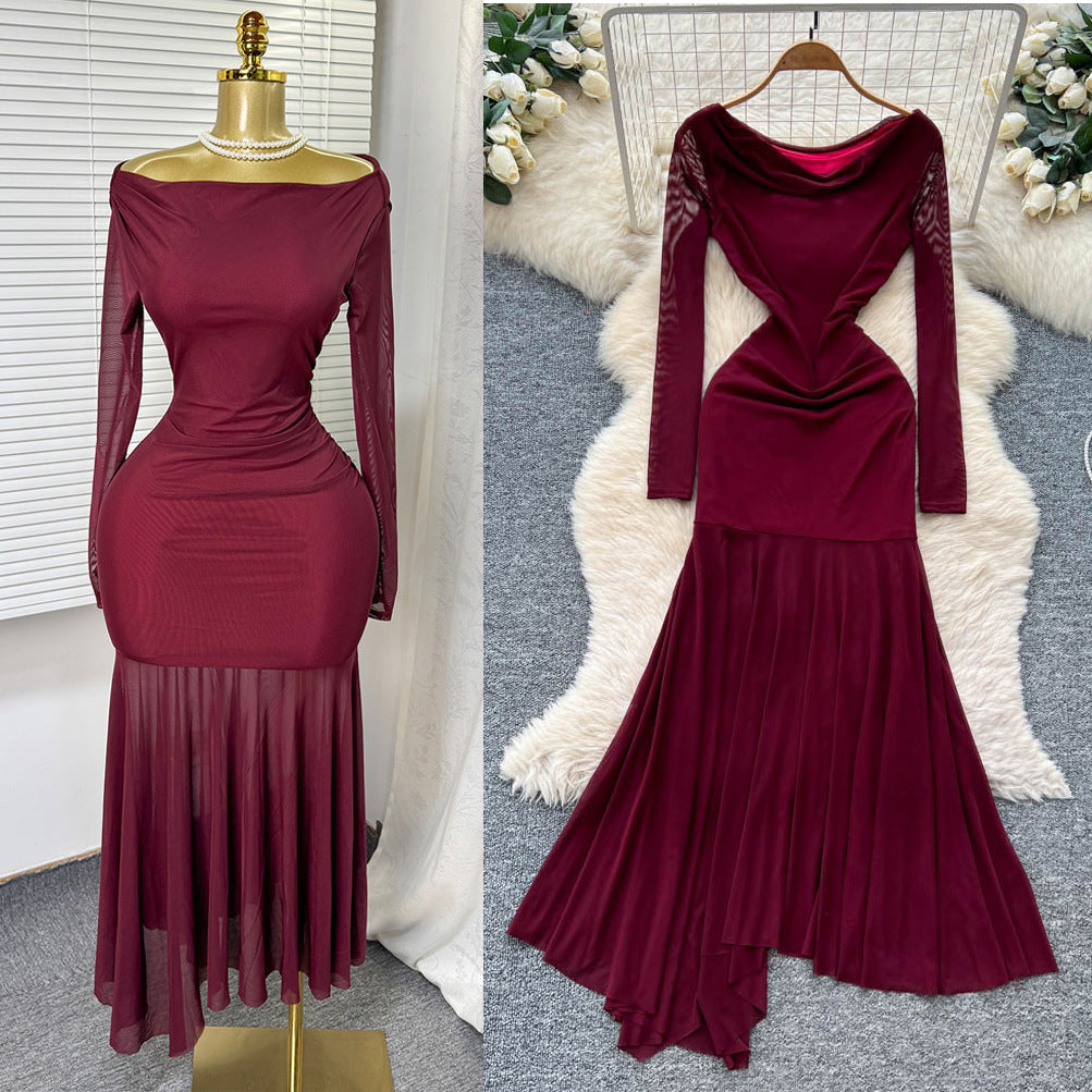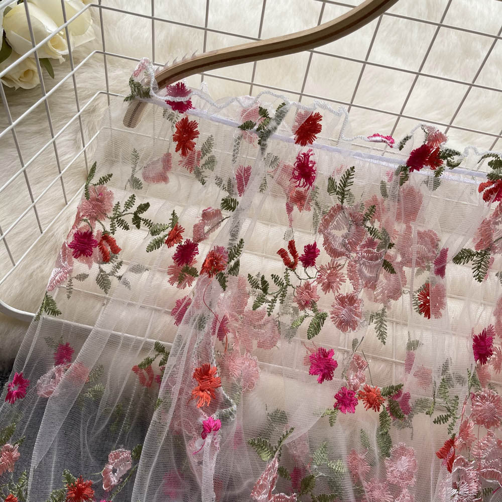 One-Word Shoulder Mesh Embroidery Perspective Shirt For Women's Summer Loose Bubble Sleeve Short Hoodie Long-Sleeved Lace Shirt