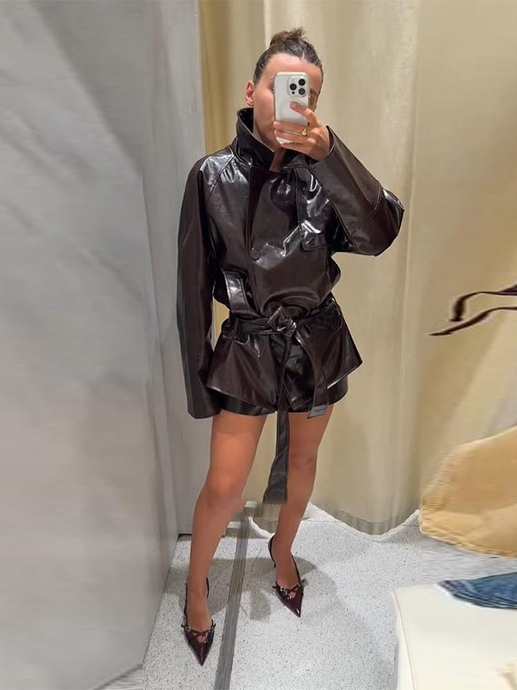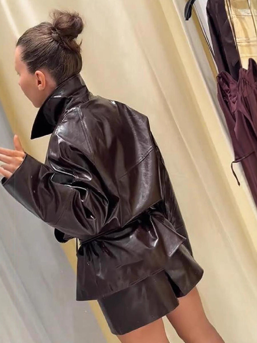 2025 Autumn Leather Collar Short Windcoat Shorts Set With Belt Retro Locomotive Leather