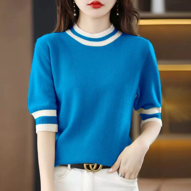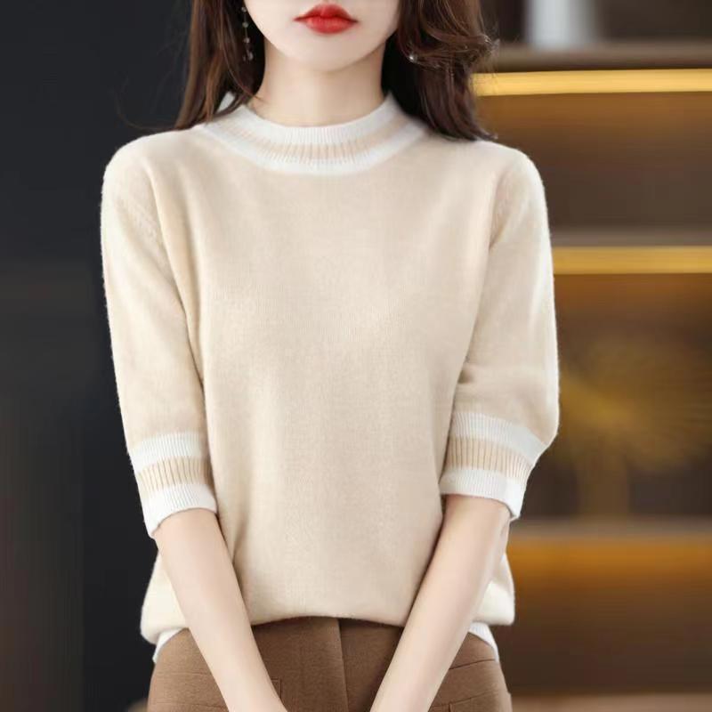 2025 Round Collar Half-Sleeve Tight Cover Sweater Five-Point Sleeve Top Female Knitting Bottom Flying Sleeve Half-High Collar
