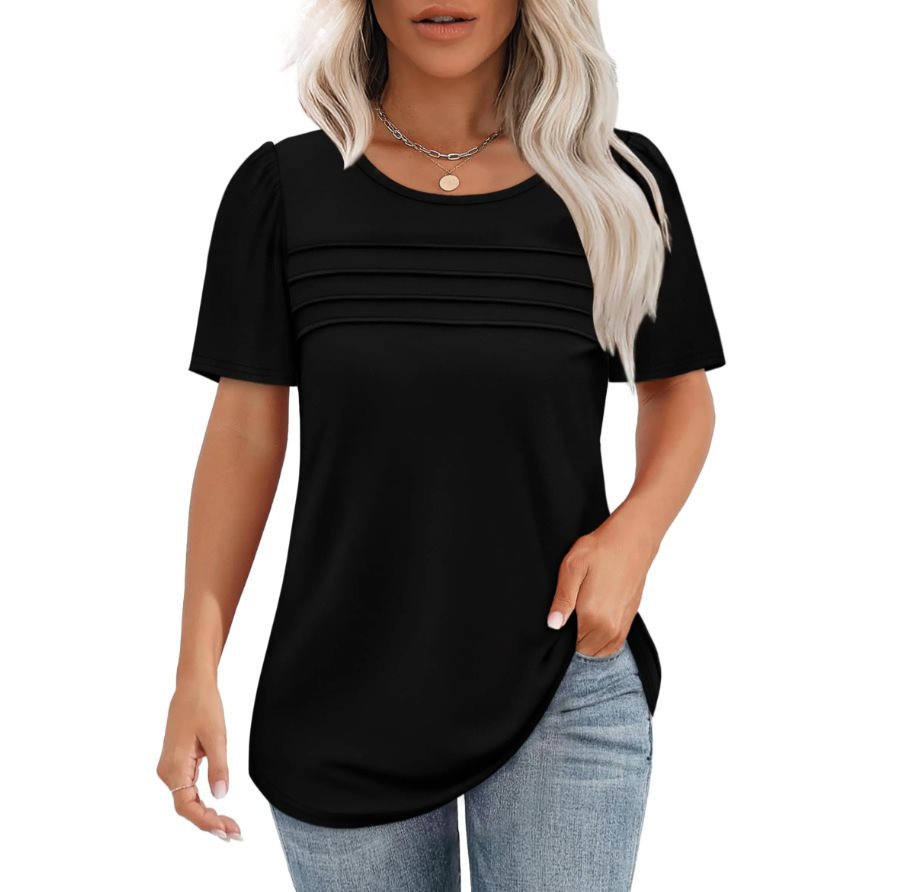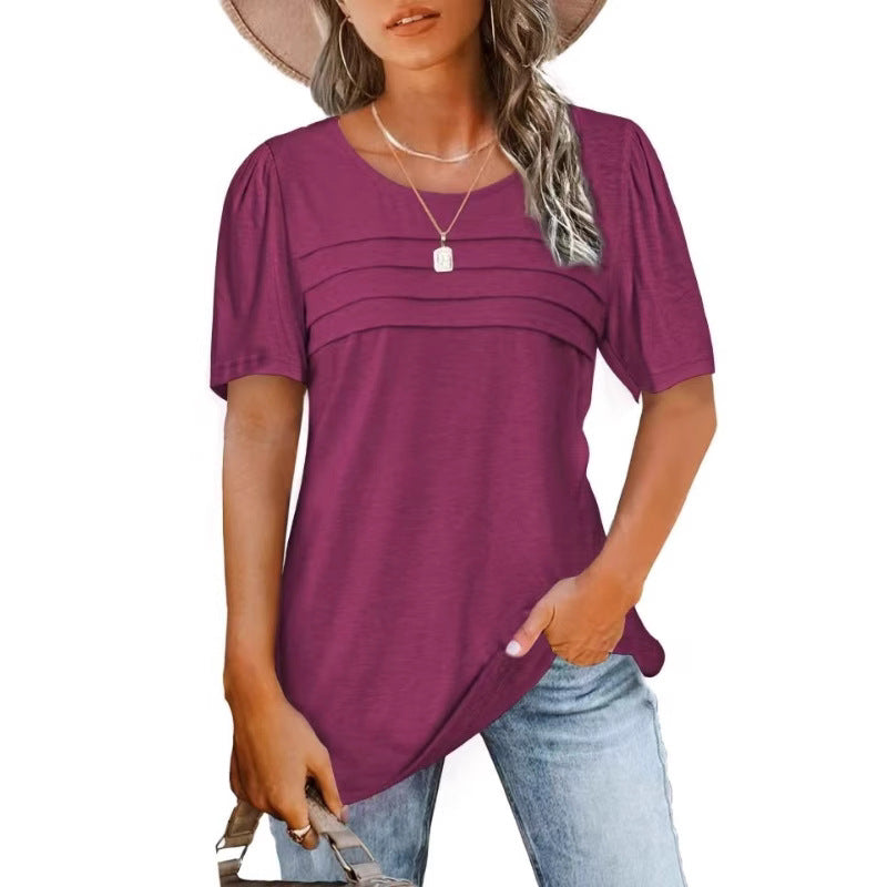 2025 Women's Summer Round-Neck Short-Sleeved Chest Tuck Line Folded Blouse T-Shirt