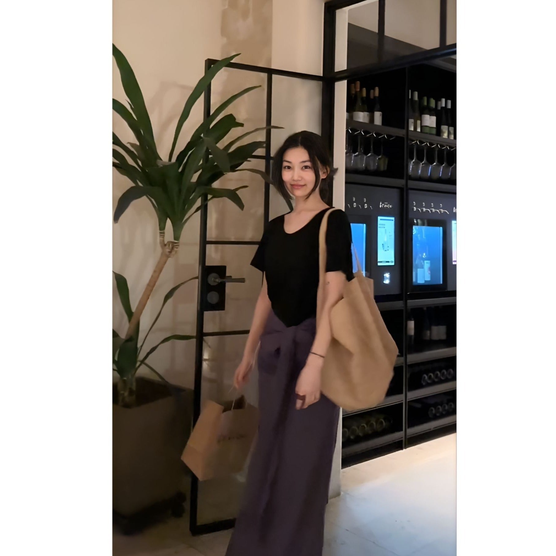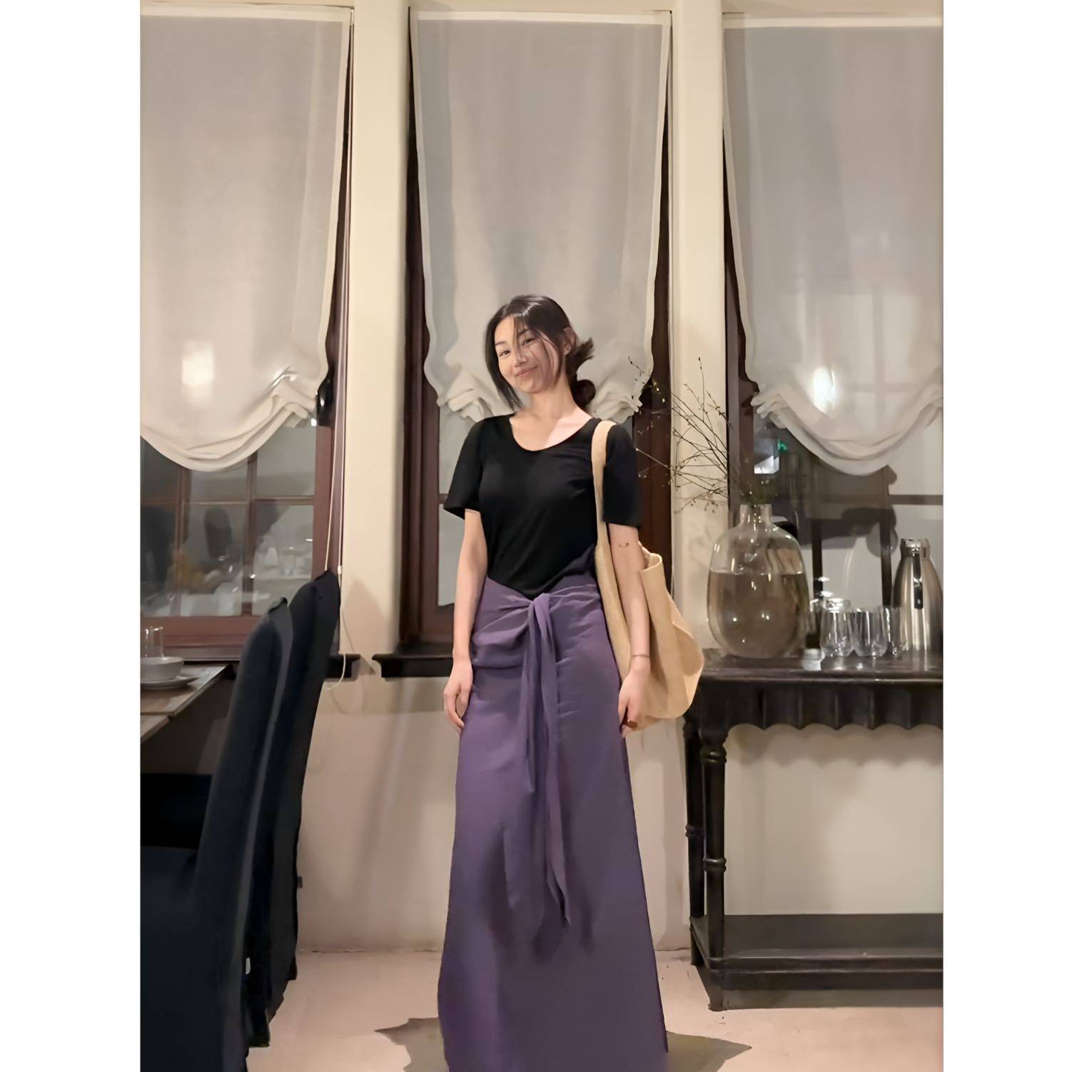 Casual Summer New Relaxation Black Short-Sleeved T-Shirt Blouse High-Waist Purple Color Tying Strap A-Word Half-Dress Woman