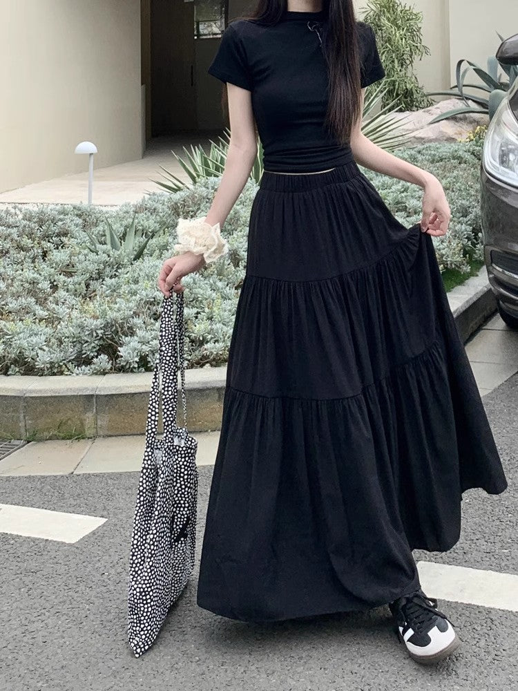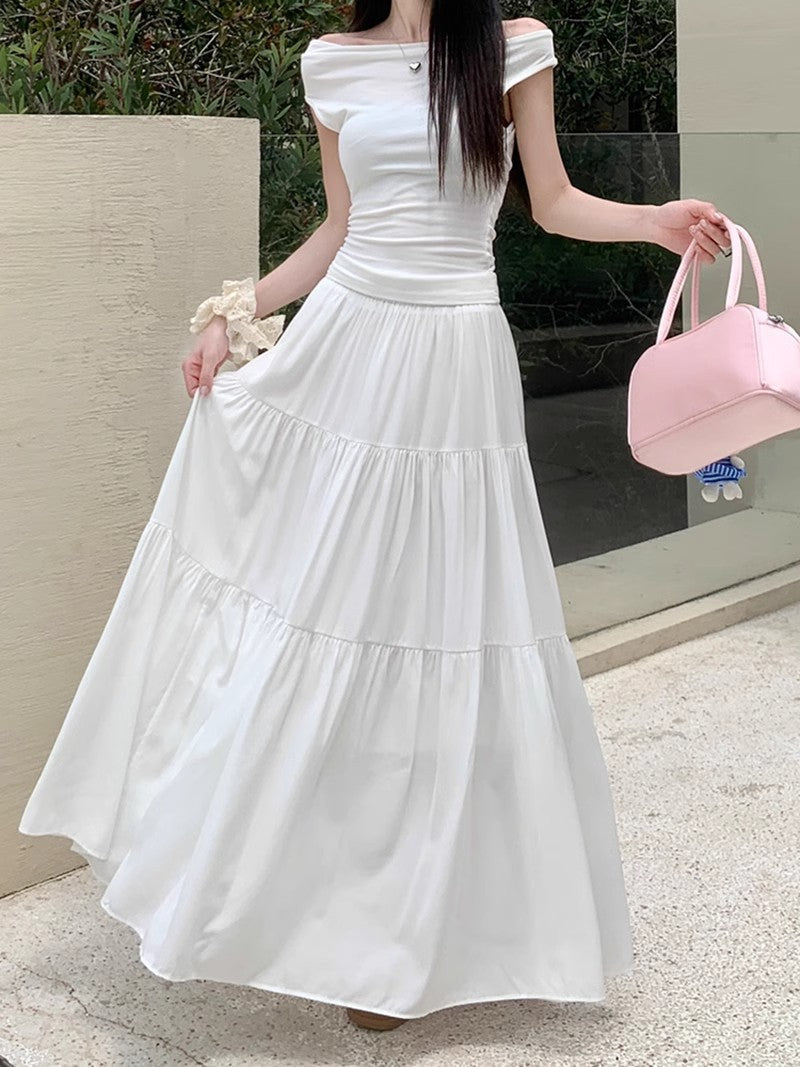 Large-Size Fatmm Cake White Dress Autumn Big Umbrella Skirt Folded Tight Body Fat Long Skirt