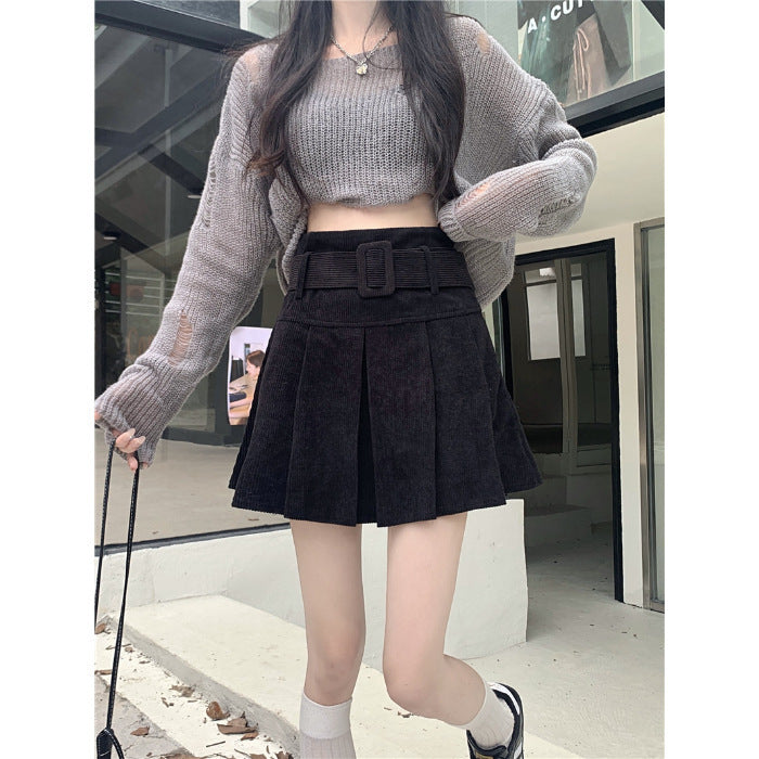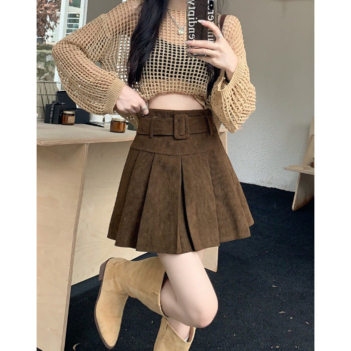 Short Skirt Women Spring And Autumn Wick Velvet Skirt Brown Large Size Fat Mm High-Waist College Windy Skirt Thin